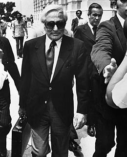 Picture: Bernard Barker carrying coat, wearing stetson-style hat, born Havana, Cuba, aged 46 at the time of assassination walks out from picket fence area stopping people proceeding to that area.